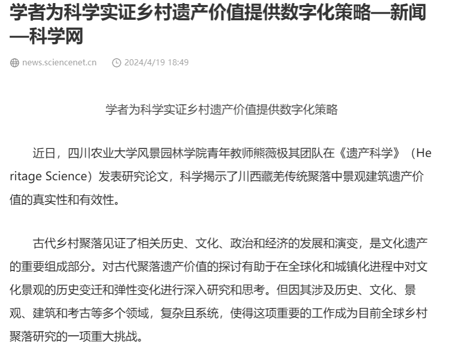 近日,英国上市公司365,英国365官方网站青年教师熊薇极其团队在《遗产科学》(Heritage Science)发表研究论文,科学揭示了川西藏羌传统聚落中景观建筑遗产价值的真实性和有效性。